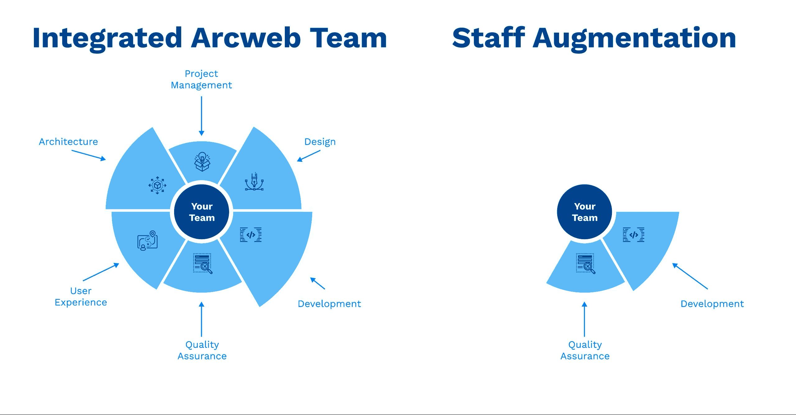 Whereas staff augmentation typically only provides staff engineers that need to be managed by the client, an integrated development team is a flexible resource that fits “around” your existing software development team, providing the skills and resources that are missing. An integrated Arcweb team can be completely self-managing and follows a uniform development process that integrates seamlessly with your own workflow, including coordination with other workstream managers.